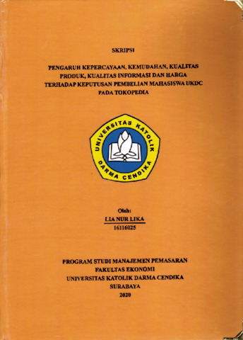 Lika, Lia Nur (2020) Pengaruh Kepercayaan,Kemudahan,Kualitas Produk,Kualias informasi dan Harga Terhadap Keputusan Pembelian Mahasiswa UKDC pada Tokopedia. Undergraduate thesis, Universitas Katolik Darma Cendika Fakultas Ekonomi.