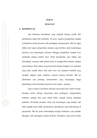| Uncontrolled Keywords: | Regulasi Pengelolaan Sampah, Paradigma Holistik Ekologis, Exted Producer Responsibility |