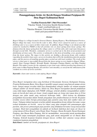 Riti, Yosefina Finsensia and Puryundari, Putri (2021) Penanggulan Krisis Air Bersih Dengan Membuat Perpipaan Di Desa Bogori Kalimantan Barat. Jurnal Pengabdian Untuk Mu negeRI, 5 (2). pp. 160-165. ISSN p-ISSN : 2550-0198 / e-ISSN : 2745-3782