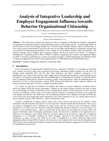 Srimulyani, Veronika Agustini and Hermanto, Yustinus Budi (2020) Analysis of Integrative Leadership and Employee Engagement Influence towards Behavior Organizational Citizenship. Journal of Advanced Research in Dynamical and Control Systems - JARDCS, 12 (01Spec). pp. 876-881. ISSN 1943-023X