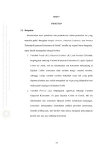 dalam penelitian ini reliabel dengan menunjukan nilai Cronbach Alpha ≥ 0,60. Uji normalitas menunjukan bahwa model regresi dalam penelitian ini memenuhi asumsi normalitas dan data menunjukan pola distribusi normal. Uji multikolinearitas pada penelitian ini menghasilkan tolerance value > 0,10 dan nilai VIF < 10, dimana tidak terdapat gejala multikolinearitas. Uji heteroskedastisitas menunjukan dalam penelitian ini tidak terjadi heteroskedastisitas. Uji regresi linear berganda yaitu Y = 1,353 + 0,094 X1 + 0,389 X2 + 0,090 X3 + 0,055 X4. Hasil uji F menghasilkan nilai Sig ,000 < 0,05 atau nilai F hitung 68,096 > F tabel 2,47 dimana model regresi dalam penelitian ini layak untuk diuji. Uji koefesien determinasi menghasilkan Adjust R Square sebesar 0,731 yang menunjukan variabel X berkontribusi pada tingkat hubungan kuat terhadap variabel Y. Variabel people, physical evidence, dan product tidak berpengaruh terhadap kepuasan konsumen Djadual Coffee, sedangkan variabel process berpengaruh signifikan terhadap kepuasan konsumen Djadual Coffee dengan menghasilkan thitung (5,218) > ttabel (1,985) dengan tingkat signifikan (0,000) < (0,05).
