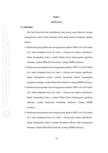Pada era millenials ini perkembangan bisnis telah memasuki tingkat digitalisasi atau yang lebih kita kenal dengan industri 4.0 . Media sosial menjadi salah satu perangkat untuk bisa memperkenalkan sebuah merek. Salah satu brand coffee shop yang terkenal di Surabaya adalah Starbucks yang berlokasi di Jalan Dr. Ir. H. Soekarno, Kedung Baruk, Rungkut, Surabaya. Penelitian ini bertujuan untuk mengetahui pengaruh media sosial dan kesadaran merek terhadap minat beli dan keputusan pembelian pada Starbucks Cabang MERR Surabaya. Dalam penelitian menggunakan metode pengambilan sampel adalah metode random sampling dengan menggunakan pernyataan kuesioner melalui google form kepada 75 responden yang merupakan populasi penelitian ini yaitu konsumen dari Starbucks Cabang MERR Surabaya. Pada Uji Validitas didapatkan hasil bahwa semua item pernyataan pada kuesioner valid sehingga dapat digunakan untuk membantu penelitian skripsi ini. Pada Uji Reliabilitas semua item pernyataan memiliki hasil Cronbach’s Alpha diatas 0,6, kecuali pernyataan X.2.4. Pada Uji t didapatkan hasil penelitian variabel media sosial (X1) = 4,526 > 1,666 dengan tingkat signifikan 0,000 < 0,050 yang artinya media sosial berpengaruh signifikan terhadap minat beli pada Starbucks Cabang MERR Surabaya, variabel kesadaran merek (X2) = 3,040 > 1,666 dengan tingkat signifikan 0,003 < 0,050 yang artinya kesadaran berpengaruh signifikan terhadap minat beli pada Starbucks Cabang MERR Surabaya, variabel media sosial (X1) = 2,729 > 1,666 dengan tingkat signifikan 0,008 < 0,050 yang artinya media sosial berpengaruh signifikan terhadap keputusan pembelian pada Starbucks Cabang MERR Surabaya, variabel kesadaran merek (X2) = 1,430 < 1,666 dengan tingkat signifikan 0,157 < 0,050 yang artinya kesadaran merek tidak berpengaruh signifikan terhadap keputusan pembelian pada Starbucks Cabang MERR Surabaya, variabel minat beli (Y1) = 6,277 > 1,666 dengan tingkat signifikan 0,000 < 0,050 yang artinya minat berpengaruh signifikan terhadap keputusan pembelian pada Starbucks Cabang MERR Surabaya. Peneliti mendapatkan kesimpulan bahwa variabel independent yaitu media sosial dan minat beli berpengaruh signifikan terhadap variabel dependent yaitu keputusan pembelian pada Starbucks Cabang MERR Surabaya. Sedangkan variabel independent kesadaran merek tidak berpengaruh terhadap variabel dependent yaitu keputusan pembelian pada Starbucks Cabang MERR Surabaya.