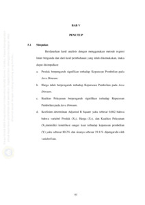 Pertumbuhan Bisnis di Jawa Timur berkembang dengan pesat, hal ini dapat dilihat dengan bertambah banyaknya pelaku bisnis yang ada. Pelaku bisnis harusmencari celah dari beraneka macam bisnis yang ada seperti bisnis kuliner khususnya makanan, bisnis pariwisata, bisnis properti, dan bisnis lainnya. Bisnis kuliner bermunculan dari sektor makanan ringan hingga makanan berat. Pelaku bisnis berlomba untuk membuat inovasi produk makanan yang dapat dijual dan diterima oleh masyarakat luas. Tujuan dari penelitian ini untuk mengetahui Pengaruh Produk, Harga, dan Kualitas Pelayanan Terhadap Keputusan Pembelian Pada Java Dimsum Di Surabaya. Pendekatan yang digunakan dalam penelitian ini adalah kuantitatif dengan menggunakan kuesioner sebagai alat pengumpulan data. Sampel pada penelitian ini berjumlah 75 responden. Hasil dari regresi linier berganda dalam penelitian ini Y=2.856+0.424X1-0.043X2+0.558X3sedangkan nilaiAdjusted R Square sebesar 0,888 yang artinya bahwa sumbangan Produk (X1), Harga (X2), dan Kualitas Pelayanan (X3) terhadap keputusan pembelian (Y) dapat dikatakan sangat kuat yaitu sebesar 88.8 % dan sisanya sebesar 11.2 % berkontribusi dari variabel lain yang tidak diteliti dalam penelitian ini.Berdasarkan hasil pengolahan data dapat dikatakan bahwa Produk berpengaruh signifikan terhadap Keputusan Pembelian dimana nilai thitung 7.759>ttabel 1.99394 dan tingkat signifikansi 0,00< 0,05. Harga tidak berpengaruh terhadap Keputusan Pembelian dimana nilai thitung -0.526 >ttabel -1.99394 dan tingkat signifikan 0,600 >0,05. Kualitas Pelayanan berpengaruh signifikan terhadap keputusan pembelian dimana thitung10.313 >ttabel1.99394 dan tingkat signifikansi 0.00< 0,05