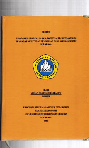 Hartanto, Johan Pratama (2021) Pengaruh produk,Harga,dan Kualitas pelayanan terhadap keputusan Pembelian pada Java Dimsum di Surabaya. Undergraduate thesis, Universitas Katolik Darma Cendika Fakultas Ekonomi.