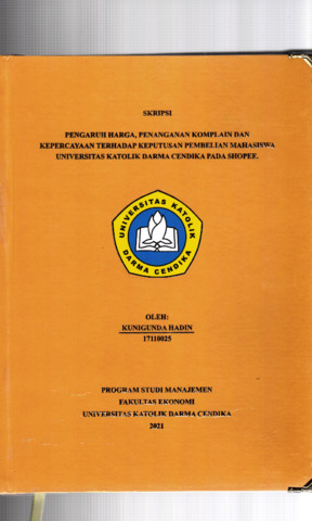 Hadin, Kunigunda (2021) Pengaruh Harga, Penanganan Komplain dan Kepercayaan Terhadap keputusan Pembelian Mahasiswa Universitas Katolik Darma Cendika pada Shopee. Undergraduate thesis, Universitas Katolik Darma Cendika Fakultas Ekonomi.