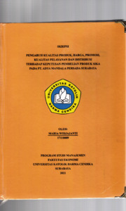 Widjajanti, Maria (2021) Pengaruh Kualitas Produk,harga,Promosi,Kualitas Pelayanan dan Distribusi Terhadap keputusan pembelian Produk Sika Pada PT. Adya Mandala Persada Surabaya. Undergraduate thesis, Universitas Katolik Darma Cendika Fakultas Ekonomi.