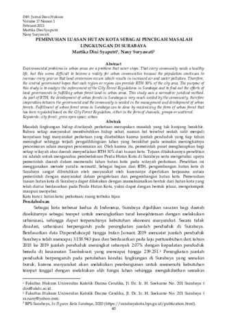 Syaputri, Martika Dini and Suryawati, Nany (2021) PEMENUHAN LUASAN HUTAN KOTA SEBAGAI PENCEGAH MASALAH LINGKUNGAN DI SURABAYA. DiH: Jurnal Ilmu Hukum, 17 (1). pp. 48-59. ISSN 2654-525X