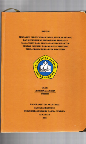 Agnesia, Christina (2021) Pengaruh Perencanaan Pajak,TIngkat Hutang dan Kepemilikan Manajerual Terhadap Manajemen Laba, Perusahaan Manufaktur Sektor Industri Barang Konsumsi yang Terdaftar di Bursa Efek Indonesia. Undergraduate thesis, Universitas Katolik Darma Cendika Fakultas Ekonomi.
