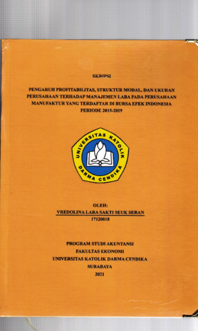Seran, Vredolina Lara Sakti Seuk (2021) Pengaruh Profitabilitas,Struktur Modal,dan Ukuran Perusahaan Terhadap Manajemen Laba pada Perusahaan Manufaktur yang Terdaftar di Bursa Efek Indonesia Periode 2015 - 2019. Undergraduate thesis, Universitas Katolik Darma Cendika Fakultas Ekonomi.