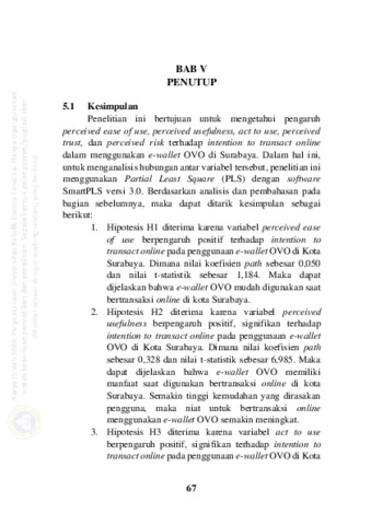 sejak awal kehadirannya di Indonesia. Digital payment merupakan inovasi dalam industri jasa finansial yang memanfaatkan teknologi sehingga memungkinkan penggunanya melakukan berbagai transaksi keuangan secara digital. Salah satu digital payment yaitu e-wallet OVO yang dikelola oleh PT. Visioner Internasional yang memberikan kemudahan dalam bertransaksi (OVO Cash) dan memberi kesempatan lebih besar dalam mengumpulkan poin (OVO Points). Saat ini aplikasi OVO dapat diakses melalui smartphone baik pengguna android maupun iOS.Tujuan dari penelitian ini adalah mengetahui pengaruh variabel perceived case to use, perceived usefulness, act to use, perceived trust, perceived risk terhadap intention to transact online pada penggunaan e-wallet OVO. Analisis yang digunakan untuk penelitian ini adalah analisis deskriptif dan analisis Partial Least
