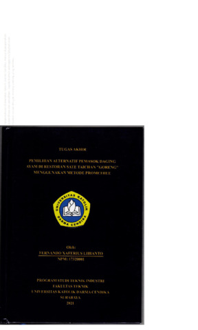 Libianto, Fernando Xaferius (2021) Pemilihan Alternatif Pemasok Daging Ayam di Restoran SAte Taichan "Goreng" menggunakan Metode Promethee. Undergraduate thesis, Universitas Katolik Darma Cendika Fakultas Teknik.