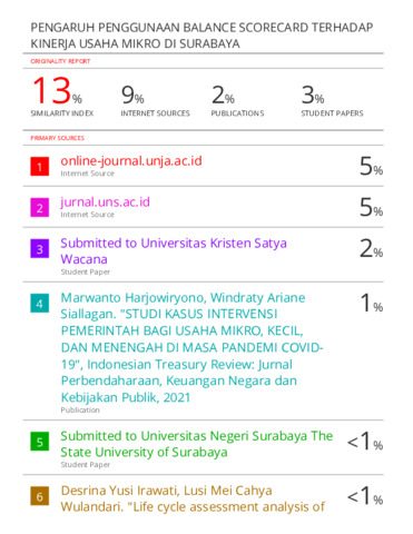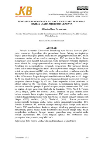 Praktek manajerial Kartu Skor Berimbang atau Balanced Scorecard (BSC) pada umumnya digunakan oleh perusahaan besar. Seiring meningkatnya tingkat pendidikan para pelaku usaha mikro, pengimplementasian BSC dalam manajemen usaha mikro semakin meningkat. BSC membantu bisnis dalam menghadapi dua masalah fundamental, yaitu mengukur performa organisasi secara efektif dan mengimplementasikan strategi untuk meningkatkan kinerja. Penelitian ini mengeksplorasi pengaruh penggunaan BSC terhadap kinerja usaha mikro serta mengetahui relasi ukuran perusahaan dengan kemampuan untuk mengimplementasi BSC pada usaha mikro melalui pendekatan statistika deskriptif dan analisa regresi linier. Penelitian dilakukan kepada pelaku usaha mikro di Surabaya dengan kategori memiliki aset atau kekayaan bersih hingga Rp 50 juta (tidak termasuk tanah atau bangunan tempat usaha) dan beromzet penjualan tahunan hingga Rp 300 juta. Total responden dalam penelitian ini adalah sebanyak 153 responden. Penelitian menkonfirmasi bahwa ukuran perusahan memiliki pengaruh pada kesiapan pengimplementasian BSC, hasil ini sejalan dengan penelitian Kimberly & Evanisko, (1981); Nord & Tucker, (1987); Hoque, (2000) dan Sherma (2020). Penelitan ini juga membuktikan bahwa semakin besar tingkat implementasi BSC suatu usaha, maka akan semakin tinggi kinerja usaha yang dicapai hal ini sejalan dengan temuan oleh Hoque, (2000); Ondieki, (2017); Dhaifallah, (2018). Ukuran perusahaan mempengaruhi kesiapan usaha mikro dalam mengimplementasikan BSC. Praktek manajerial BSC terbukti mampu meningkatkan kinerja usaha mikro. Praktek BSC membutuhkan kesiapan dengan didukung peningkatan ukuran perusahaan; pelaku usaha mikro hendaknya melibatkan tenaga kerja dalam menjalankan usahanya. Dengan ukuran perusahan yang memadai maka praktik implementasi BSC dapat berjalan optimal dan berdampak pada pencapaian kinerja usaha yang lebih baik.