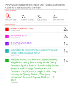 UD Darmaji merupakan salah satu UKM yang menerima pesanan pembuatan sandal dan sepatu. Beberapa tahun terakhir UD Darmaji mengalami penurunan produksi, terdapat beberapa penyebab penurunan produksi dari UD Darmaji diantaranya adalah kurangnya permintaan dan kurang tepatnya penyusunan strategi pemasaran dalam strategi pemasaran. Terdapat beberapa metode dan analisis yang digunakan dalam penelitian ini yaitu Analisis SWOT (Strength, Weaknesses, Opportunities, Threats), matriks IFE (Internal Factor Evaluation Matrix) dan EFE (Eksternal Factor Evaluation Matrix) serta AHP (Analitycal hierarchy process) yang digunakan untuk pembobotan serta QSPM (Quantitative Strategic Planning Matriks) untuk menentukan strategi apa saja yang akan dipilih. Hasil analisa didapatkan strategi melakukan penjualan secara online baik menggunakan sosial media maupun situs-situs jual beli secara online dengan perolehan nilai TAS (Total Atratctive Score) paling tinggi yakni 5,614, strategi meningkatkan kualitas packaging menjadi lebih baik dan lebih menarik bernilai TAS sebesar 5,336, dan strategi menjadikan tempat kerja menjadi lebih nyamann dengan menata ulang pabrik sehingga dapat terlihat lebih rapi dan bersih dan melakukan pernerapan 5R nilai TAS 5,242, yang akan di jadikan saran untuk UD Darmaji.