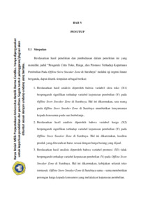 0.405 X2 + 0.046 X3. The F test resulted in a Sig value, 000 < 0.05 or a calculated F value of 51,826 > F table 2.73 where the regression model in the study is worth testing. The determination coefficient test resulted in an Adjust R Square of 0.673 which showed variable X contributed at a strong relationship level to variable Y. Promotional variables had no effect on purchasing decisions at the Offline Store Sneaker Zone in Surabaya meanwhile, the variable image of the store, significantly affects the purchase decision at the Offline Store Sneaker Zone in Surabaya by producing tcount (2,670) > ttabel (1,993) with a significant level (0.000) ≤ (0.05), and price variables significantly affect the purchase decision on the Offline Store Sneaker Zone in Surabaya by producing tcount (2,128) > ttabel (1,993) with a level of significance (0.03) < (0.05).