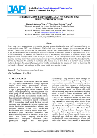 Andrew, Richard and Lusy, Lusy and Teresa, Josephine Rebeka (2023) EFEKTIVITAS DAN DAMPAK KEBIJAKAN TAX AMNESTY BAGI PEREKONOMIAN INDONESIA. Jurnal Akuntansi dan Pajak, 23 (2). pp. 1-6. ISSN 1412-629X l
