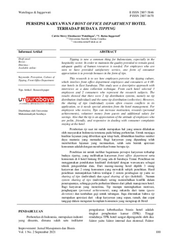 Watulingas, Calvin Mercy Ebenhaezer and Inggawati, V. Ratna (2021) Persepsi Karyawan Front Office Department Hotel Terhadap Budaya Tipping. Improvement: Jurnal Manajemen dan Bisnis, 1 (2). pp. 100-108. ISSN E 2807-5846 ; P 2807-8470