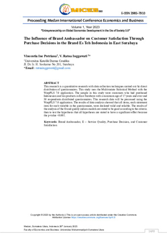 Putriana, Vincentia Ine and Inggawati, V. Ratna (2023) The Influence of Brand Ambassador on Customer Satisfaction Through Purchase Decisions in the Brand Es Teh Indonesia in East Surabaya. In: Proceeding Medan International Conference on Economic and Business 2023. MICEB, 1 . Departement Faculty of Economics and Business, Universitas Muhammadiyah Sumatera Utara (UMSU), Medan, pp. 1670-1682. ISBN 2985-7910