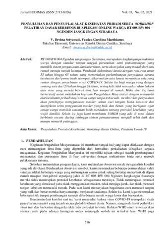 Setyawati, V. Devina and Marthianus, Yessica Carolina (2021) Penyuluhan dan Penyuplaian Alat Kesehatan Pribadi serta Workshop Pelatihan Dasar Berbisnis di Aplikasi Online Warga RT.008 RW. 004 Nginden Jangkungan Surabaya. Jurnal BUDIMAS, 3 (2). pp. 516-521. ISSN 2715-8926