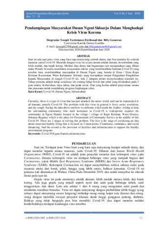 Ferdinand, Deograsias Yoseph Yustinianus and Gunawan, Billy (2020) Pendampingan Masyarakat Dusun Ngeni Sidoarjo Dalam Menghadapi Krisis Virus Korona. Jurnal Pengabdian Masyarakat IPTEKS, 6 (1). pp. 73-78. ISSN p:2527-5216 e: 2528-116X