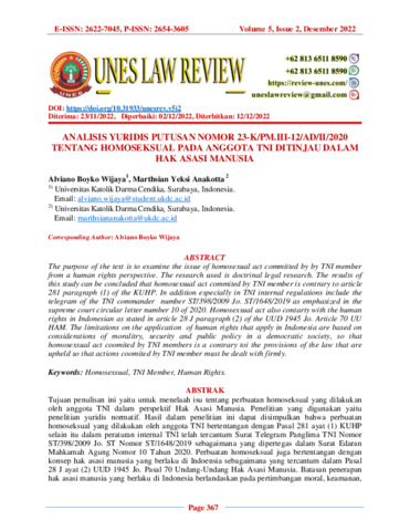 Wijaya, Alviano Boyko and Anakotta, Marthsian Yeksi (2022) Analisis Yuridis Putusan Nomor 23-K/PM.III-12/AD/II/2020 tentang Homoseksual pada Anggota TNI Ditinjau dalam Hak Asasi Manusia. UNES Law Review, 5 (2). pp. 367-378. ISSN (E) 2622-7045, (P) 2654-3605