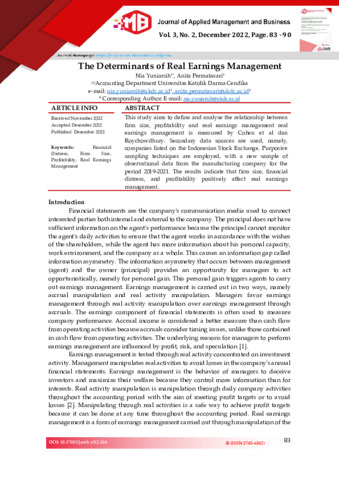 Yuniarsih, Nia and Permatasari, Anita (2022) The Determinants of Real Earnings Management. Journal of Applied Management and Business (JAMB), 3 (2). pp. 83-90. ISSN 2745-6382