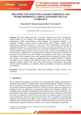 Bivianti, Vinda and Yuniarsih, Nia (2022) THE EFFECT OF EXECUTIVE CHARACTERISTICS, CEO OVERCONFIDENCE, CAPITAL INTENSITY ON TAX AVOIDANCE. In: Proceeding 2nd International Conference on Business & Social Sciences (ICOBUSS). "Digital Transformation Business Strategy in Post Covid-19", 2 . STIESIA SURABAYA, Surabaya, pp. 895-906. ISBN 2746-5667