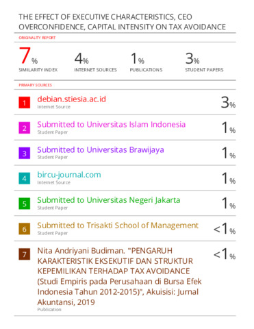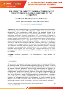This study examines the effect of executive characteristics, CEO overconfidence, capital intensity on tax avoidance. The independent variables of this study are executive characteristics, CEO overconfidence, capital intensity; the dependent variable is tax avoidance. Earnings measure executive characteristics before interest expense, taxes, depreciation, amortization divided by a total asset. CEO overconfidence is measured by combining these proxies: overinvestment (also known as an excess investment), the ratio of liabilities to equity, and dividend yield. If two of the three combinations of proxies are met, then the related company is given a value of one (1) and a value of zero (0) otherwise. The capital intensity is measured by a total fixed asset divided by a total asset. Tax avoidance is measured by cash effective tax rates (CETR). The population in this study is 310 primary consumption sector companies listed on the Indonesian Stock Exchange from 2016 to 2020. The sample was selected by purposive sampling method and finally obtained 175 primary consumption sector companies that fulfill the criteria. Data were analyzed using multiple regression analysis models. The result shows that executive characteristics and capital intensity positively influence tax avoidance. CEO overconfidence is negatively influencing tax avoidance.