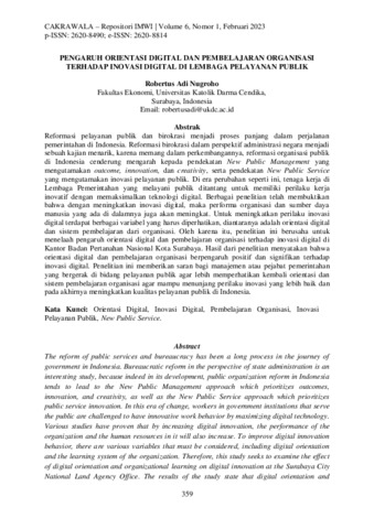 Nugroho, Robertus Adi (2023) Pengaruh Orientasi Digital dan Pembelajaran Organisasi Terhadap Inovasi Digital di Lembaga Pelayanan Publik. Cakrawala Repositori IMWI, 6 (1). pp. 359-379. ISSN 2620-8814
