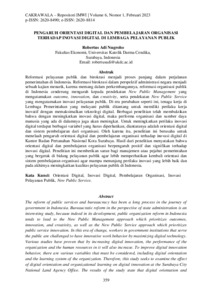 Reformasi pelayanan publik dan birokrasi menjadi proses panjang dalam perjalanan pemerintahan di Indonesia. Reformasi birokrasi dalam perspektif administrasi negara menjadi sebuah kajian menarik, karena memang dalam perkembangannya, reformasi organisasi publik di Indonesia cenderung mengarah kepada pendekatan New Public Management yang mengutamakan outcome, innovation, dan creativity, serta pendekatan New Public Service yang mengutamakan inovasi pelayanan publik. Di era perubahan seperti ini, tenaga kerja di Lembaga Pemerintahan yang melayani publik ditantang untuk memiliki perilaku kerja inovatif dengan memaksimalkan teknologi digital. Berbagai penelitian telah membuktikan bahwa dengan meningkatkan inovasi digital, maka performa organisasi dan sumber daya manusia yang ada di dalamnya juga akan meningkat. Untuk meningkatkan perilaku inovasi digital terdapat berbagai variabel yang harus diperhatikan, diantaranya adalah orientasi digital dan sistem pembelajaran dari organisasi. Oleh karena itu, penelitian ini berusaha untuk menelaah pengaruh orientasi digital dan pembelajaran organisasi terhadap inovasi digital di Kantor Badan Pertanahan Nasional Kota Surabaya. Hasil dari penelitian menyatakan bahwa orientasi digital dan pembelajaran organisasi berpengaruh positif dan signifikan terhadap inovasi digital. Penelitian ini memberikan saran bagi manajemen atau pejabat pemerintahan yang bergerak di bidang pelayanan publik agar lebih memperhatikan kembali orientasi dan sistem pembelajaran organisasi agar mampu menunjang perilaku inovasi yang lebih baik dan pada akhirnya meningkatkan kualitas pelayanan publik di Indonesia.