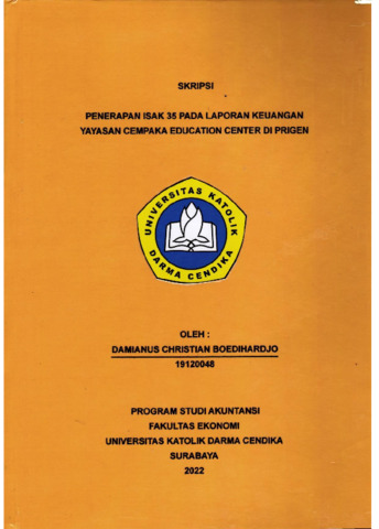 Boedihardjo, Damianus Christian (2023) PENERAPAN ISAK 35 PADA LAPORAN KEUANGAN YAYASAN CEMPAKA EDUCATION CENTER DI PRIGEN. Undergraduate thesis, Universitas Katolik Darma Cendika Fakultas Ekonomi.