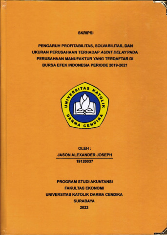 Joseph, Jason Alexander (2022) PENGARUH PROFITABILITAS, SOLVABILITAS, DAN UKURAN PERUSAHAAN TERHADAP AUDIT DELAY PADA PERUSAHAAN MANUFAKTUR YANG TERDAFTAR DI BURSA EFEK INDONESIA PERIODE 2019-2021. Undergraduate thesis, Universitas Katolik Darma Cendika Fakultas Ekonomi.
