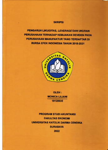 LILIANI, MONICA (2023) PENGARUH LIKUIDITAS, LEVERAGE DAN UKURAN PERUSAHAAN TERHADAP KEBIJAKAN DEVIDEN PADA PERUSAHAAN MANUFAKTUR YANG TERDAFTAR DI BURSA EFEK INDONESIA TAHUN 2018-2021. Undergraduate thesis, Universitas Katolik Darma Cendika Fakultas Ekonomi.