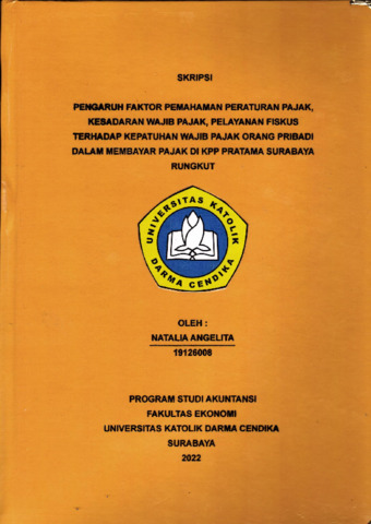ANGELITA, NATALIA (2023) PENGARUH FAKTOR PEMAHAMAN PERATURAN PAJAK, KESADARAN WAJIB PAJAK, PELAYANAN FISKUS TERHADAP KEPATUHAN WAJIB PAJAK ORANG PRIBADI DALAM MEMBAYAR PAJAK DI KPP PRATAMA SURABAYA RUNGKUT. Undergraduate thesis, Universitas Katolik Darma Cendika Fakultas Ekonomi.