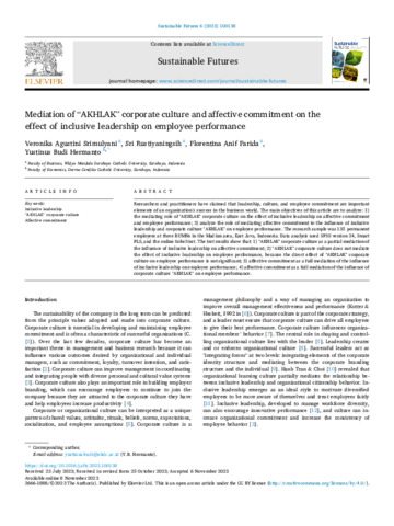 Srimulyani, Veronika Agustini and Rustiyaningsih, Sri and Hermanto, Yustinus Budi and Farida, Florentina Anif (2023) Mediation of “AKHLAK” corporate culture and affective commitment on the effect of inclusive leadership on employee performance. Sustainable Futures Journal, 6 (100138). pp. 1-14. ISSN 2666-1888