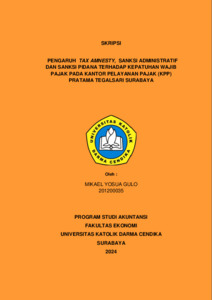 Gulo, Mikael Yosua (2024) PENGARUH TAX AMNESTY, SANKSI ADMINISTRATIF DAN SANKSI PIDANA TERHADAP KEPATUHAN WAJIB PAJAK PADA KANTOR PELAYANAN PAJAK (KPP) PRATAMA TEGALSARI SURABAYA. Undergraduate thesis, Universitas Katolik Darma Cendika.