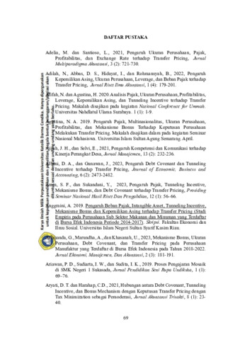 Transfer pricing is a policy owned by the company to determine the transfer costs of various types of transactions such as intangible assets, goods, or services contained in parties that have affiliated relationships both at home and abroad. This research aims to examine the effect of company size, debt covenant, bonus mechanism on transfer pricing. The population were 75 manufacturing companies listed on the Indonesia Stock Exchange in 2020-2022. The research sample was 45 companies selected using purposive sampling method with quantitative research type. The data used is secondary data, namely the company's financial statements obtained from www.idx.co.id. The data analysis used is the SmartPLS 4 statistical test. The results showed that: (1) Company size negatively affects transfer pricing; (2) Debt covenant positively affects transfer pricing; (3) Bonus mechanism does not show any influence on transfer pricing. It is hoped that through the results of this research, investors can make selection investment decisions and review the risks that may faced.