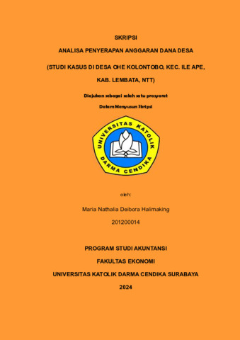 Halimaking, Maria Nathalia (2024) ANALISA PENYERAPAN ANGGARAN DANA DESA (STUDI KASUS DI DESA KOLONTOBO, KECAMATAN ILE APE, KABUPATEN LEMBATA, NTT). Undergraduate thesis, Universitas Katolik Darma Cendika Fakultas Ekonomi.