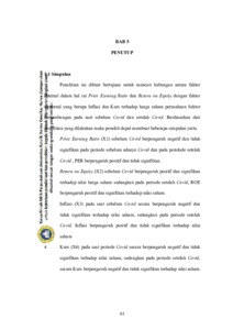 theory and research, it is stated that PER affects the value of shares. Researchers collected data from various sources and processed various existing data and found the following results. From the research results, it was found that inflation during the period before and after Covid-19 had no significant effect on stock value. For the exchange rate before and during the covid-19 did not have a significant ef fect on the value of shares. ROE was found to have a significant effect on stock value both before and during Covid. PER was found to have no significant effect in the period before and during Covid.