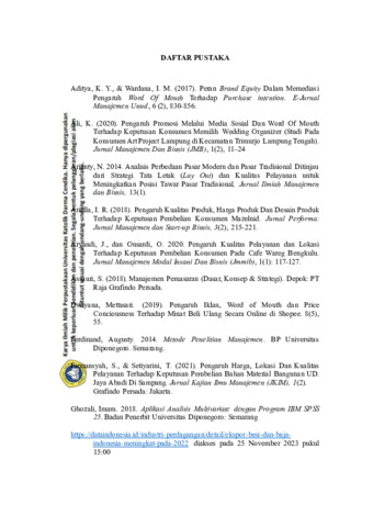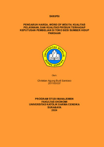 Santoso, Christian Agung Budi (2024) PENGARUH HARGA, WORD OF MOUTH, KUALITAS PELAYANAN DAN KUALITAS PRODUK TERHADAP KEPUTUSAN PEMBELIAN DI TOKO BESI SUMBER HIDUP PANDAAN. Undergraduate thesis, Universitas Katolik Darma Cendika Fakultas Ekonomi.