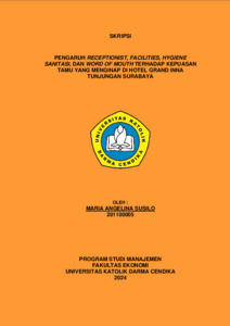 Susilo, Maria Angelina (2024) PENGARUH RECEPTIONIST, FACILITIES, HYGIENE SANITASI, DAN WORD OF MOUTH TERHADAP KEPUASAN TAMU YANG MENGINAP DI HOTEL GRAND INNA TUNJUNGAN SURABAYA. Undergraduate thesis, Universitas Katolik Darma Cendika Fakultas Ekonomi.