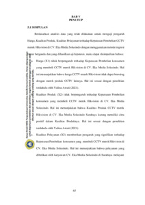 > 0,227 sehingga dapat dikatakan bahwa seluruh item pernyataan valid. Pada uji Reliabilitas didapatkan bahwa semua variabel memiliki nilai Cronbach's Alpha > 0,50 sehingga dapat disimpulkan bahwa seluruh variabel yang ada dalam penelitian ini reliabel dan dapat digunakan. Pada uji Multikolinearitas memiliki nilai Tolerance lebih dari 0,1 dan VIF kurang dari 10 sehingga dapat dikatakan bahwa dalam model regresi ini tidak terjadi masalah multikoliniearitas. Pada uji Heteroskesdasitas didapat bahwa semua variabel memiliki nilai absolut residual lebih besar dari 0.05, sehingga dapat disimpulkan bahwa tidak terjadi masalah heteroskedastisitas pada model regresi ini. Pada uji Normalitas dapat dilihat bahwa Tampilan grafik normal probability plot disimpulkan pola distribusi pada grafik normal probability plot terlihat titik-titik menyebar disekitar garis diagonal, serta penyebarannya mendekati dan mengikuti arah garis diagonal, sehingga memenuhi asumsi normalitas. Pada uji Regresi Linear Berganda ditemukan model persamaan regresi yaitu : Y = 0.088 + 0.139X1 + 0.157X2 + 0.301X3. Uji Koefisien Determinan didapatkan bahwa hasil penelitian Adjusted R Square sebesar 0.555 atau 55.5%. Pada Uji t didapatkan hasil penelitian variabel Harga (X1) = thitung (1.321) < ttabel (1.993) dengan tingkat signifikan (0.191 > 0.05) yang artinya Harga tidak berengaruh signfikan terhadap Keputusan Pembelian, variabel Kualitas Produk (X2) = thitung (1.930) < ttabel (1.993) dengan tingkat signifikan (0.058 < 0.05) yang artinya Kualitas Produk tidak berengaruh signifikan terhadap Keputusan Pembelian, variabel Kualitas Pelayanan (X3) = thitung (5.087) < ttabel (1.993) dengan tingkat signifikan (0.000 < 0.05) yang artinya Kualitas Pelayanan berpengaruh signifikan terhadap Keputusan Pembelian. Kesimpulan bahwa Kualitas Produk dan Kualitas Pelayanan berpengaruh terhadap Keputusan Pembelian CCTV merek Hikvision di CV. Eka Media Solusindo Surabaya, sedangkan Harga tidak berpengaruh terhadap Keputusan Pembelian CCTV merek Hikvision di CV. Eka Media Solusindo Surabaya.