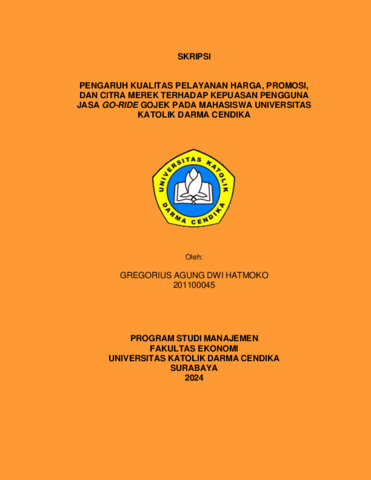 Hatmoko, Gregorius Agung Dwi (2024) Pengaruh Kualitas Pelayanan, Harga, Promosi, dan Citra Merek Terhadap Kepuasan Pengguna Jasa Go-Ride Gojek Pada Mahasiswa Universitas Katolik Darma Cendika. Undergraduate thesis, Universitas Katolik Darma Cendika Fakultas Ekonomi.