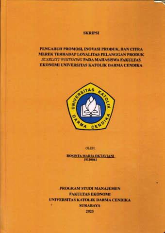 OKTAVIANI, ROSINTA MARIA (2023) PENGARUH PROMOSI, INOVASI PRODUK, DAN CITRA MEREK TERHADAP LOYALITAS PELANGGAN PRODUK SCARLETTWHITENING PADA MAHASISWA FAKULTAS EKONOMI UNIVERSITAS KATOLIK DARMA CENDIKA. Undergraduate thesis, Universitas Katolik Darma Cendika Fakultas Ekonomi.
