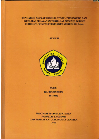 HARIYANTO, RIO (2023) PENGARUH DISPLAY PRODUK, STORE ATMOSPHERE, DAN KUALITAS PELAYANAN TERHADAP IMPULSE BUYING DI HOKKY FRUIT SUPERMARKET MERR SURABAYA. Undergraduate thesis, Universitas Katolik Darma Cendika Fakultas Ekonomi.