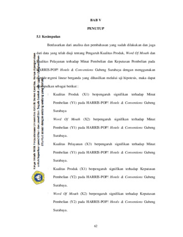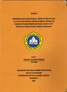 PRIBADI, RACHEL HAPSARI (2023) PENGARUH KUALITAS PRODUK, WORD OF MOUTH DAN KUALITAS PELAYANAN TERHADAP MINAT PEMBELIAN DAN KEPUTUSAN PEMBELIAN PADA HARRIS-POP! HOTELS & CONVENTIONS GUBENG SURABAYA. Undergraduate thesis, Universitas Katolik Darma Cendika Fakultas Ekonomi.