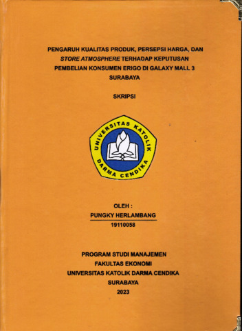 HERLAMBANG, PUNGKY (2023) PENGARUH KUALITAS PRODUK, PERSEPSI HARGA, DAN STORE ATMOSPHERE TERHADAP KEPUTUSAN PEMBELIAN KONSUMEN ERIGO DI GALAXY MALL 3 SURABAYA. Undergraduate thesis, Universitas Katolik Darma Cendika Fakultas Ekonomi.