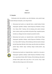 Atmosphere to Erigo's Purchase Decision at Galaxy Mall 3 Surabaya based on adjusted R square is 78.4% which is included in the high category. The results of data analysis t test shows that the product quality variable has a significant effect on purchasing decisions with t count 4.534 > t table 1.66660 and a significance of 0.000 <0.05, the price perception variable has a significant effect on purchasing decisions with tcount 2.369 > t table 1.66660 and a significance of 0.021 < 0.05, the Store Atmosphere variable has a significant effect on purchasing decisions with tcount 3.758 > t table 1.66660 and a significance of 0.000 <0.05.