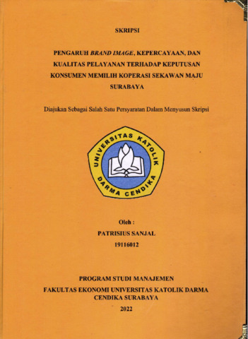 SANJAL, PATRISIUS (2023) PENGARUH BRAND IMAGE, KEPERCAYAAN, DAN KUALITAS PELAYANAN TERHADAP KEPUTUSAN KONSUMEN MEMILIH KOPERASI SEKAWAN MAJU SURABAYA. Undergraduate thesis, Universitas Katolik Darma Cendika Fakultas Ekonomi.