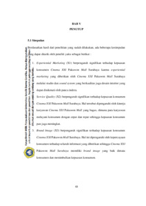 with the increasing public demand, other companies began to appear because the Indonesian film industry was also growing. Cinema XXI, which is the pioneer and trade mark of cinema in Indonesia, needs to focus on experiential marketing, service quality and brand image to be able to survive in the competition. This research is a quantitative research by distributing questionnaires and using purposive sampling methods. The research sample was consumers who had