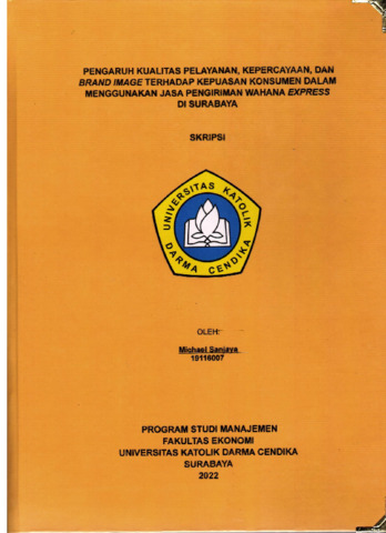 SANJAYA, MICHAEL (2023) PENGARUH KUALITAS PELAYANAN, KEPERCAYAAN, DAN BRAND IMAGE TERHADAP KEPUASAN KONSUMEN DALAM MENGGUNAKAN JASA PENGIRIMAN WAHANA EXPRESS DI SURABAYA. Undergraduate thesis, Universitas Katolik Darma Cendika Fakultas Ekonomi.
